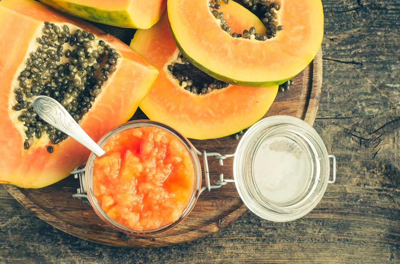 Papaya flesh contains papain, and alpha-hydroxyl acid, which gets rid of dead skin cells. Additionally, it brightens the skin and even out the sunburnt skin pigments.